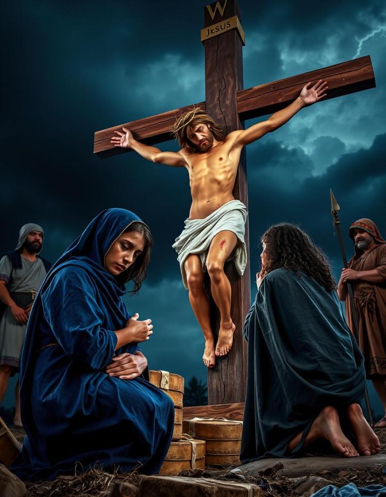 His body, a sacrifice. His mother knelt beneath Him, her cries wrenching.